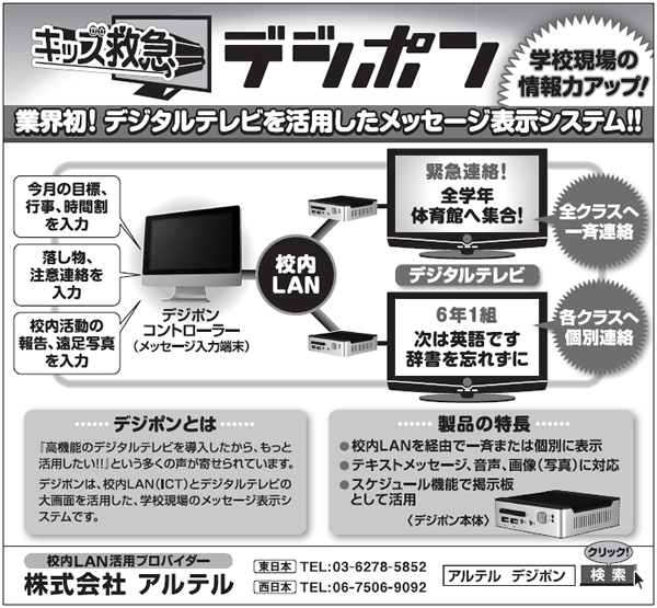 ICTを活用したキッズ救急(校内インターホン)が日立市立坂本小学校、京都市立小中学校約50校に採用されたことをお知らせいたします。